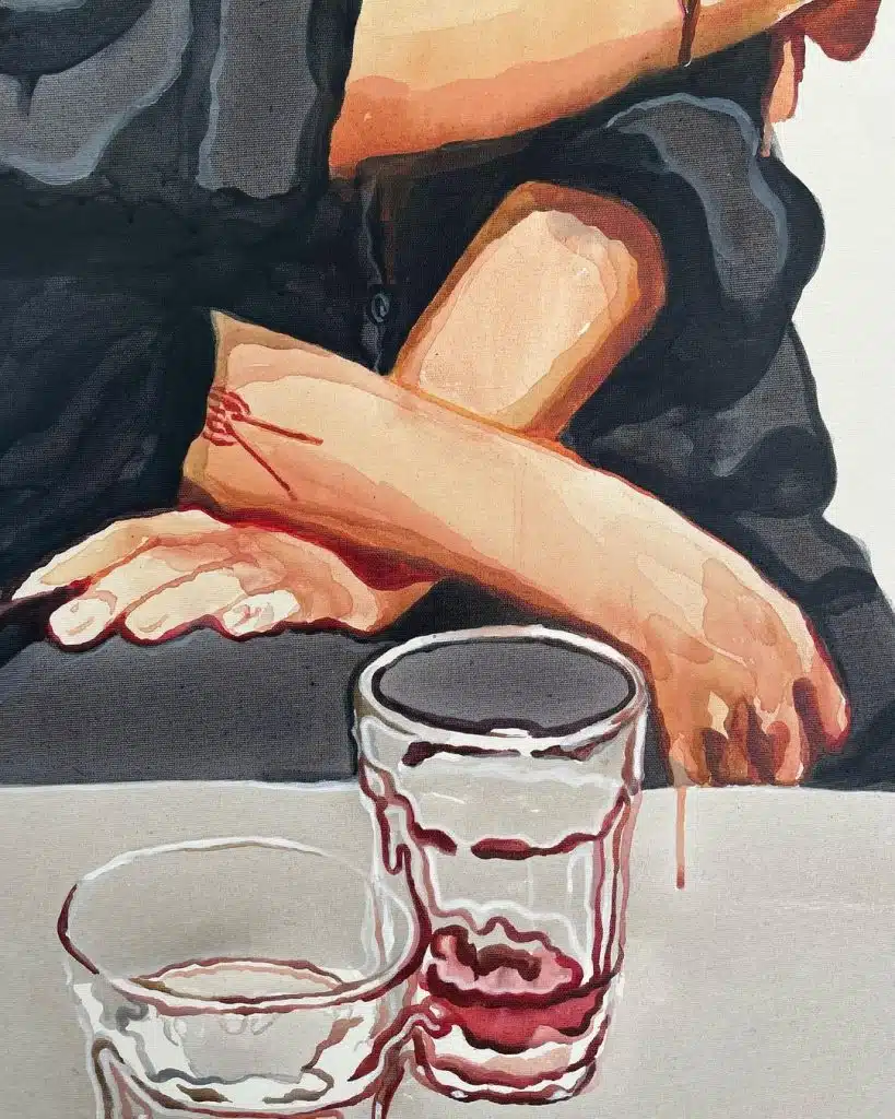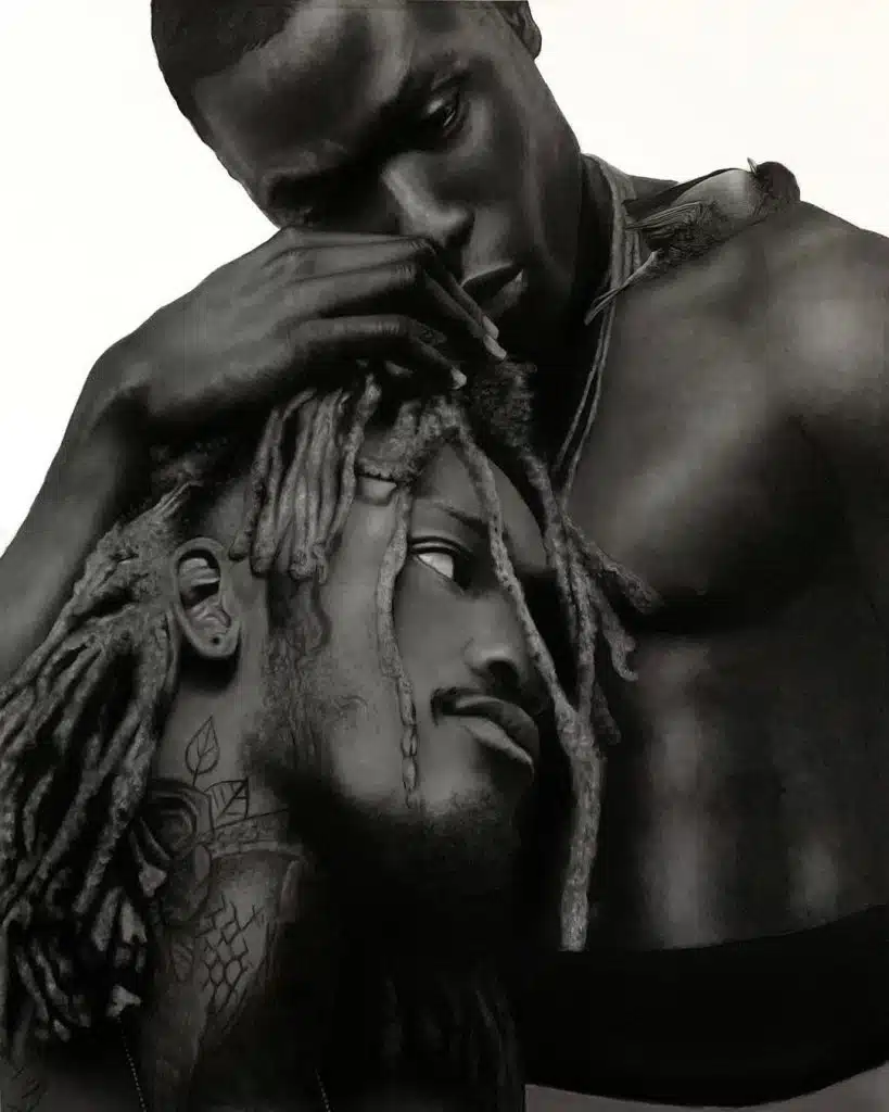 Parece fotografia, parece colagem, mas são pinturas. O artista paraense expressa seu interesse pela figura humana criando imagens hiper-realistas, que destacam corpos entrosados em ternura. Trazendo protagonismo à figuras negras e homossexuais, sob uma estética próxima da produção publicitária de moda, Ritchelly afirma seu compromisso de empoderamento através do amor.