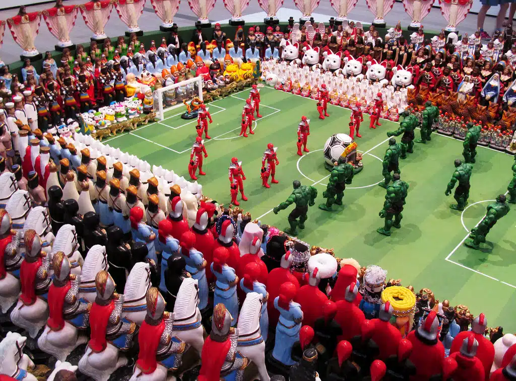 Na obra em questão, o paulista recriou o estádio com um time de Incríveis Hulks enfrentando uma equipe de Power Rangers. Nas arquibancadas há Budas, Jesus e legiões de cavalaria romana, entre ícones da cultura pop. Segundo Leiner, trata-se de uma reflexão sobre os poderes concorrentes do mundo: religião e cultura de consumo, nenhuma das quais tinha os interesses do povo em seu coração.