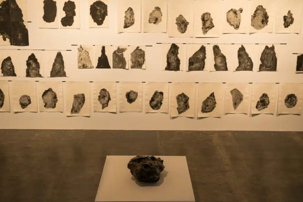 Pouco antes, no térreo, está exposto o Meteorito Santa Luzia, peça que sobreviveu ao incêndio que destruiu o Museu Nacional no início de setembro de 2018, episódio que denota o descaso com a preservação e o desenvolvimento das instituições culturais e de pesquisa brasileiras. Esse objeto é trazido também como um enunciado. Ali também está uma obra da artista colombiana Gala Porras-Kim: a palma de uma mão impressa sobre papel intitulada Proposal for Luzia é um trabalho comissionado pela Bienal e parte da pesquisa que a artista fez com o fóssil de Luzia, o fóssil humano mais antigo da América, que também estava no museu e foi encontrado entre os escombros.