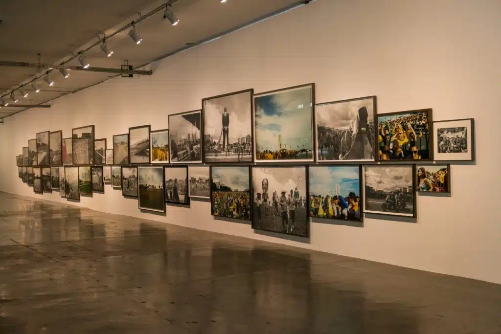Obras que fazem menção a tensões políticas têm presença marcante na exposição. No primeiro andar, fotografias de Mauro Restiffe das posses de Lula, em 2003, e de Bolsonaro, em 2018, explicitam bastante essa rusga. Elas tomam toda uma parede paralela a obras de Regina Silveira da série Dilatáveis, de 1971, que mostra figuras como políticos e militares em sombras desproporcionais a seu tamanho real. Aqui, o enunciado é o Sino de Ouro Preto, que reza a lenda que foi o único sino que subversivamente tocou quando Tiradentes, inimigo da Coroa, foi enforcado.