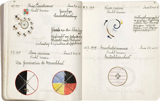 Hilma Af Klint é hoje, provavelmente, o nome mais conhecido dentre essas mulheres, resultado de um trabalho de pesquisa e divulgação de seu trabalho que se iniciou nos anos 1980 e ganhou força a partir de 2013, com a grande mostra realizada no Moderna Museet, em Estocolmo, Suécia. Ela foi pioneira na virada da figuração para a abstração, mesmo antes de Kandinsky. Desde a década de 1870 Klint frequentava sessões de espiritismo na tentativa de se comunicar com os mortos. A artista interessava-se por uma dimensão que não a nossa realidade concreta, acreditando na existência de um mundo espiritual. No final do século, junto a quatro outras mulheres, formou o grupo “De Fem” [As Cinco], que se reunia toda sexta feira para sessões mediúnicas. A artista escreve que entrava em contato com “Mestres Superiores”, que lhe diziam o que fazer, como pintar, o que dizer, etc. Toda sua extensa obra é marcada por simbolismos e linguagens próprias, repetição de signos e frequentes alusões às dimensões alternativas. Sua obra máxima foi o conjunto de obras intitulado “Pinturas do Templo”, realizado entre 1906 e 1915, composto por 193 pinturas divididas em séries.