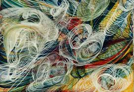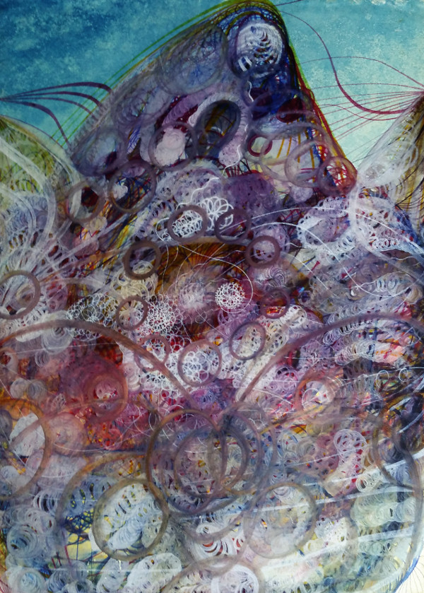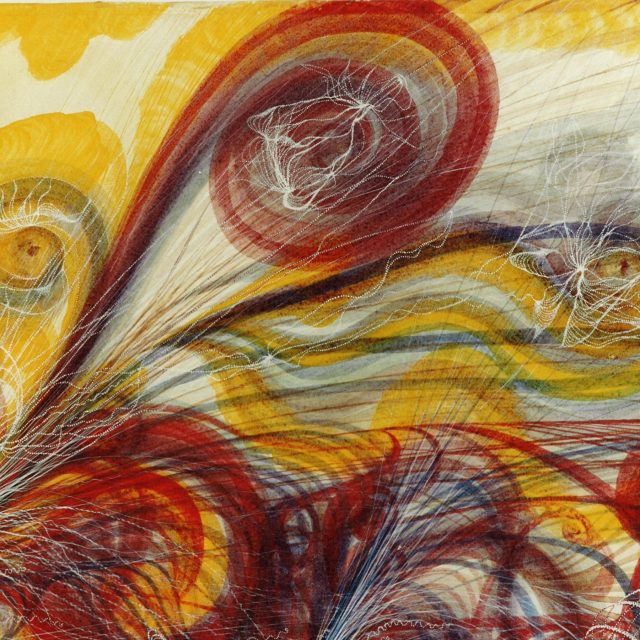 Georgiana Houghton nasceu em 1814, nas Ilhas Canárias, mas mudou-se anos depois para Londres. A artista também frequentava sessões espíritas, e desenvolvia suas habilidades mediúnicas desde 1859. Sua primeira obra realizada a partir deste trabalho espiritual foi realizada em 1861: um desenho. Pelos anos seguintes, Houghton continuou a produzir aquarelas e desenhos guiada pelo espírito chamado “Henry Lenny and 70 Archangels”, criando mais de 150 trabalhos extraordinários. Sua criação tinha o mesmo método dos desenhos automáticos ou das experiências cegas – a artista iniciava sem saber onde iria chegar. Usando cores vibrantes em formas abstratas espiraladas, Houghton acumulava camadas de traços em intrincadas redes e redemoinhos. A artista esforçou-se muito para exibir seus trabalhos ainda em vida – sozinha, organizou uma mostra individual na New British Gallery, em 1871, um fracasso de vendas e com críticas ambivalentes. Ademais, Georgiana foi ignorada pelos historiadores mesmo apesar do pioneirismo de seu corpo de trabalho, que também antecedeu a abstração de Kandinsky e Malevich por muitos anos.