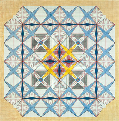 De uma geração um pouco mais jovem que Klint, Emma Kunz foi uma artista e curandeira que viveu entre 1892 e 1963, na Suíça. Kunz se autodenominava uma pesquisadora, mas era reconhecida como alguém com capacidade de curar e ajudar pessoas. Hoje seu trabalho artístico vem ganhando reconhecimento crescente, inclusive com a exposição que acaba de abrir na Serpentine Gallery, em Londres. Aos 18 anos, Kunz começou a usar suas habilidades telepáticas e a proferir profecias, utilizando também um pêndulo para adivinhar o futuro. Ficou famosa por seus tratamentos e pelos conselhos que dava, chegando a ser chamada de milagrosa. A artista produzia grandes padrões gráficos sobre papel. Seus trabalhos eram formas geométricas que reproduziam ritmo e vibração, marcados por simbolismo e transformação da figura em medida, princípio, ordem. Kunz deixou um legado de mais de 400 desenhos, e parte desta coleção hoje permanece exposta no Emma Kunz Zentrum, em Würenlos, Suíça.