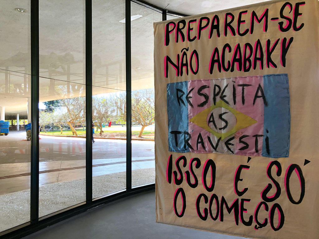 A artista Vulcanica PokaRopa é uma performer travesti, conhecida pela produção da série “Desaquenda” pela Cucetas Produções, disponível integralmente no YouTube. Parte dessa série de entrevistas com mulheres trans e travestis está exposta na vitrine do MAM que antes abrigava a famosa aranha de Louise Bourgeois. A instalação traz diversos estandartes com frases de luta e trechos dos depoimentos das entrevistadas, além de 4 televisores que trazem ao público uma seleção desse material documental.