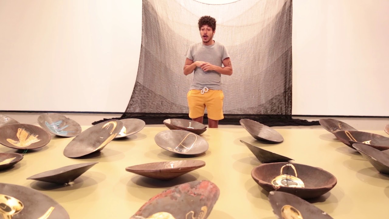 A obra de Dalton Paula é uma das mais belas instalações na mostra. O artista, que mora e trabalha em Goiânia, desenvolve há anos pesquisas que discutem versões da história brasileira e as possíveis reescritas dessa história de maneira a inserir toda uma cultura de herança africana apagada dos registros oficiais. Com Bamburrô, Paula monta uma espécie de banda de marcha ou fanfarra, em posição de desfile, a partir das batéias usadas na mineração no Brasil e gamelas de madeira. Esses anacrônicos utensílios – ainda em uso em garimpos pequenos ou clandestinos – foram coletados na Serra Pelada, Pilar de Goiás e Diamantina, e carregam a marca do tempo e do desgaste do uso, e ganham uma nova camada com pinturas de instrumentos musicais feitas com tinta a óleo e folha de ouro. A marcha caminha silenciosa, evocando as tradições folclóricas brasileiras e afro-atlânticas.