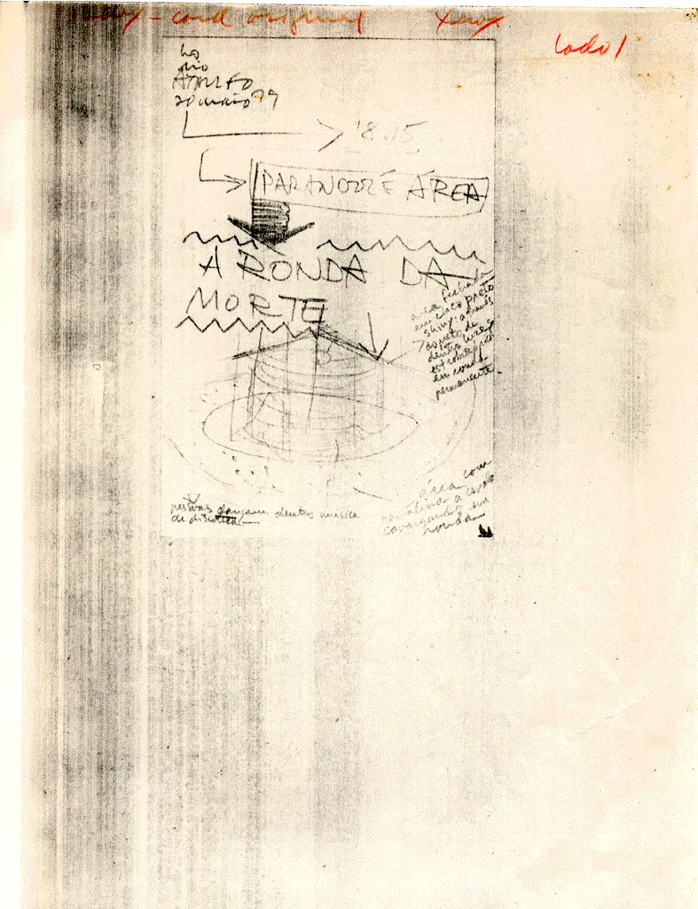 Em 1979, abalado pela execução brutal de mais um de seus amigos, Hélio Oiticica escreveu uma carta para a fotógrafa Martine Barrat, descrevendo um “parangolé-área” chamado “A ronda da morte”. Este seria uma espécie de tenda de circo, com luzes estroboscópicas e música em seu interior, onde as pessoas poderiam entrar e dançar. Enquanto a festividade aconteceria dentro da tenda, homens a cavalo emulando uma patrulha policial a cercariam, numa alusão direta ao estado de vigilância e violência que persistia, apesar da aparente normalidade do cotidiano.