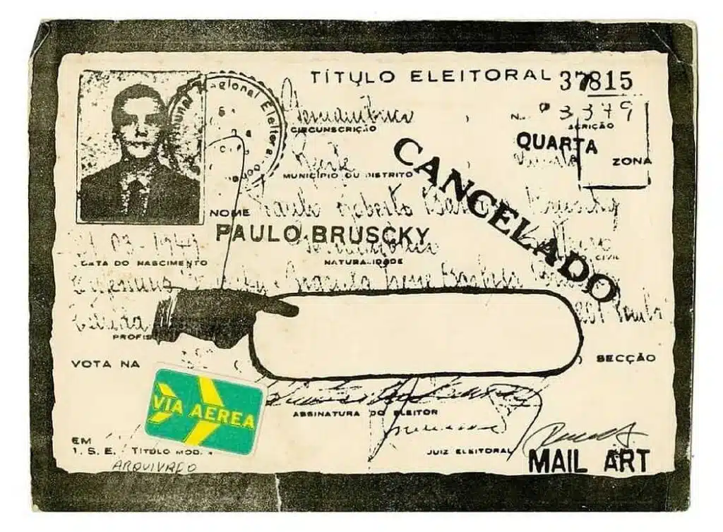 Durante aquele tempo, a obra “Título de eleitor cancelado” teve cópias amplamente difundidas através da rede de arte postal. Ao utilizar o título de eleitor como material artístico, Bruscky transforma esse documento, que atesta nossa cidadania, em um símbolo da supressão da participação popular nas decisões políticas, evidenciado pelo carimbo de cancelamento. A circulação da obra, enviada para diversas localidades ao redor do mundo pelos correios, serviu como um meio de denúncia da restrição dos direitos fundamentais durante o período ditatorial no Brasil. Bruscky, assim como muitos outros artistas da época, enfrentou censura constante e foi preso pelo menos duas vezes, não apenas por participar de manifestações estudantis, mas também devido ao caráter contestador de suas produções.