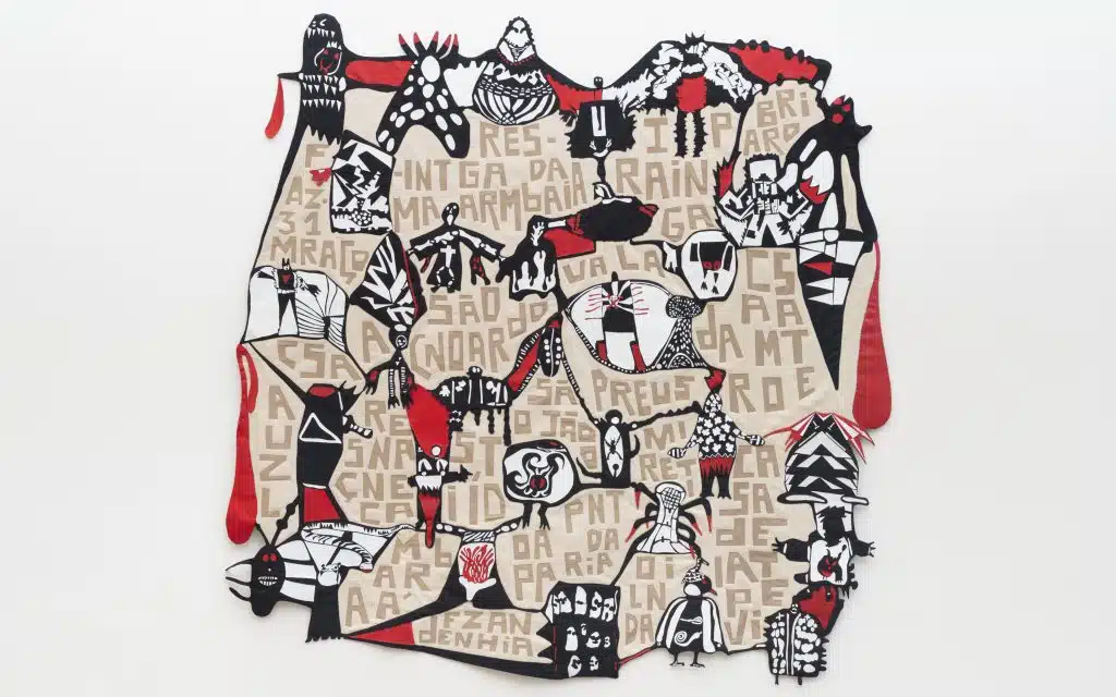 O trabalho feito em tapeçaria apresenta uma colcha de retalhos elaborada, onde monstros infantis e criaturas estilizadas se cruzam com letreiros que identificam locais clandestinos de tortura, assassinato e ocultação de corpos durante a ditadura militar brasileira. Essas representações resgatam o universo explorado pela artista em sua série contínua “O nome do medo” (2015 – em andamento), na qual ela investiga os medos infantis. A obra exige uma atividade semelhante à decifração de arquivos, revelando as práticas criminosas do regime ditatorial. Os nomes dos locais, com letras embaralhadas, desafiam a compreensão do espectador, refletindo a dificuldade em reconhecer e entender um passado marcado pelo trauma.