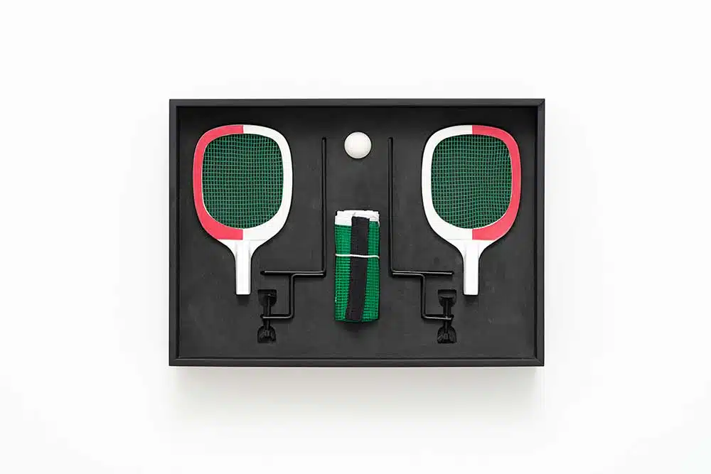 Mas é em “Ping-Poems” que aquilo que parecia ser tão abstrato evidentemente se solidifica. A obra bem-humorada nos convida a brincarmos com tempo – representado por uma bolinha de pingue-pongue –, enquanto o vemos passar (de um lado para o outro). Ela é composta por uma mesa de tênis de mesa que tem uma metade do tampo espelhado e fixado na parede e, ao lado, quatro caixas guardam conjuntos de raquetes, redes e bolinhas, igualmente modificadas de acordo com seu propósito: uma raquete com um furo no centro “para atrasar o tempo”; uma raquete com rede no lugar do plano maciço “para parar o tempo”; raquetes, bolinha e rede cortadas ao meio “para dividir o tempo”; raquetes com um grande buraco “para ultrapassar o tempo”.