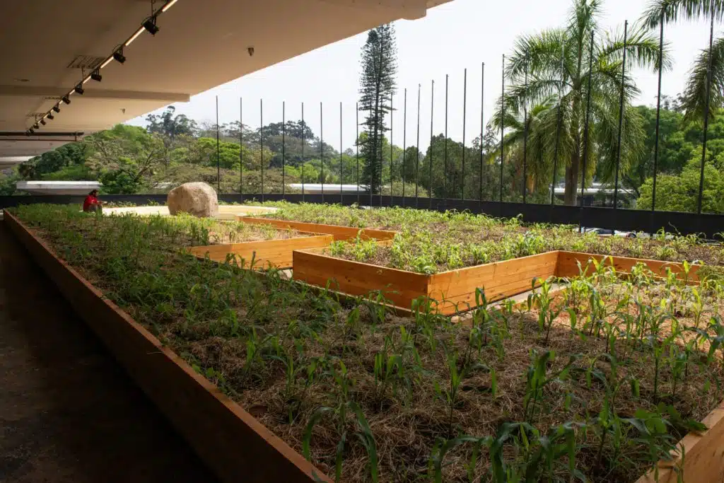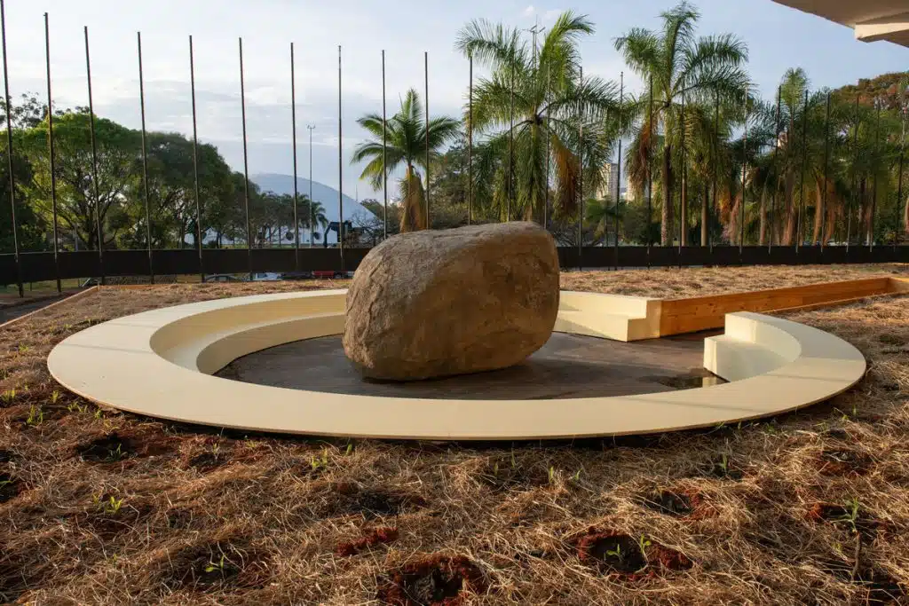 Na estrutura de madeira que sustenta o plantio, há um caminho que conduz à um espaço circular, rodeado por uma arquibancada para o público poder sentar e ter momentos de troca. Ao centro deste círculo está uma grande pedra com inscrições em baixo relevo, que foi feita em colaboração com a pesquisadora Francineia Baniwa, para contar as histórias da cosmogonia do povo Baniwa e dos primeiros contatos com os brancos.