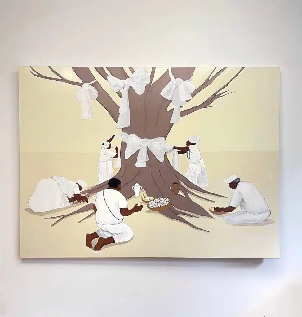 O artista e cientista político natural do Rio, apresenta na exposição “Um defeito de cor”, atualmente em cartaz no Museu Nacional da Cultura Afro-Brasileira, em Salvador, sua pintura chamada “Iroko”. O título refere-se ao Orixá do tempo, da ancestralidade e do destino. Em países africanos, Iroko vive na árvore que leva seu nome, mas no Brasil, onde essa árvore não é nativa, foi-lhe atribuída a grandiosa gameleira branca, também conhecida como o baobá brasileiro. A pintura de Ribs retrata a festa anual de Iroko, quando a faixa branca de morim que o entrelaça é trocada.