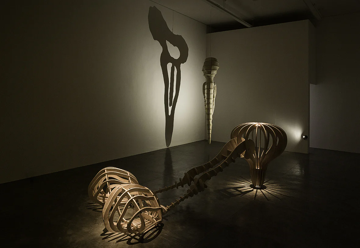 outras duas, inéditas, realizadas em 2017. As obras foram produzidas em materiais como bronze, madeira, tecido e fibra de vidro, e exploram áreas cheias e vazias que criam formas de inesperada plasticidade. As esculturas formam com a sombra produzida pela