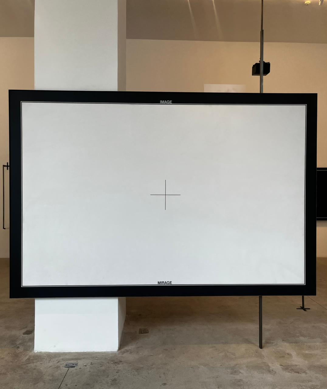 O título da mostra deriva de uma das obras centrais do conjunto, “Image/Mirage”. Como ocorre em diversos trabalhos desse período, o próprio título aparece inscrito dentro da pintura, integrando a composição visual. No centro da obra, um símbolo gráfico semelhante a um sinal de soma pode também ser lido como um alvo ou uma mira, uma ambiguidade que, segundo o curador, abre a leitura da obra para uma dimensão associada à violência e ao conflito.