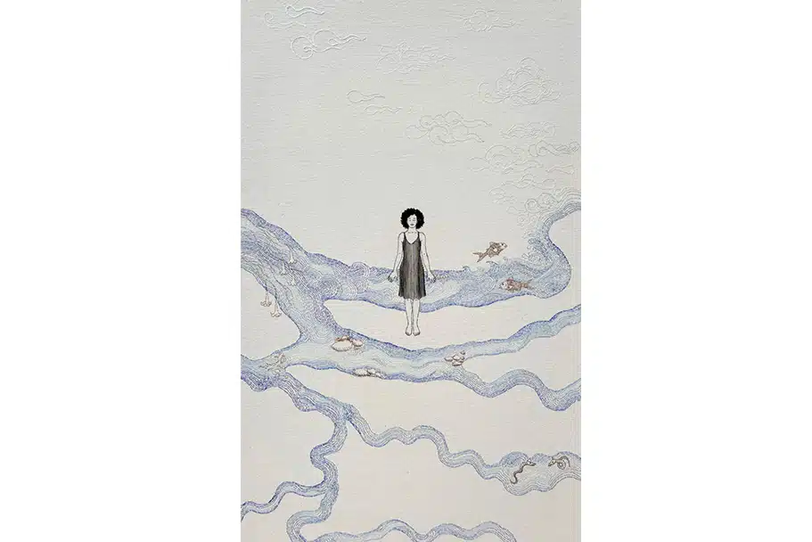 O estande de Gaby Indio da Costa Arte Contemporânea reúne maioria de artistas mulheres — por acaso, segundo a própria galerista. São elas Caroline Veilson, Rosângelo Dorazio, Anna Paola Protasio, Bel Barcellos, Marcus André e Manoel Novello. Os delicados bordados de Bel Barcellos divagam sobre sonhos, angústias, escolhas, limites e afetos. No trabalho inédito da série Muda, ela aborda o tempo, o corpo como abrigo e o fluxo da vida, tecendo significados sobre a palavra “muda”. Segundo a própria artista: “Como ensinamento observado na natureza, as mudas nos apontam caminhos para renovação, transformação e crescimento”.