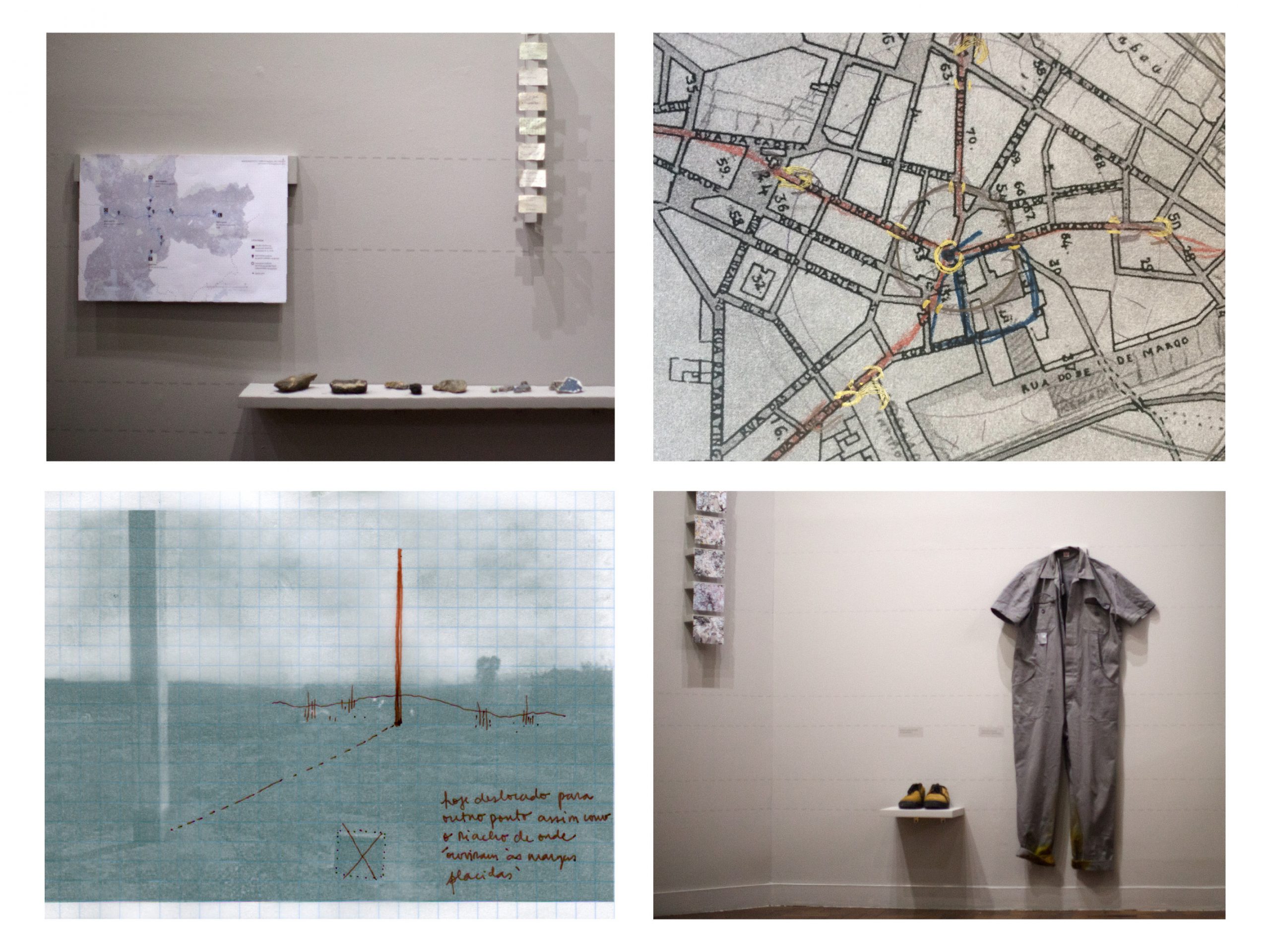 Em 2014, a artista teve sua primeira individual, “Sobre ruínas, memórias e monumentos” na Caixa Cultural São Paulo. Apresentado como uma instalação composta por itens tão diversos como desenhos, mapas, fotografias, pedras e a roupa da artista, o projeto conciliava a experiência de caminhadas pela cidade a uma extensa pesquisa no arquivo fotográfico do município de São Paulo, norteada por seus monumentos e pela amnésia de seu passado colonial (trata-se de uma cidade, afinal, que “deslocou” tanto o seu marco zero quanto o local do grito de independência para atender a conveniências narrativas).