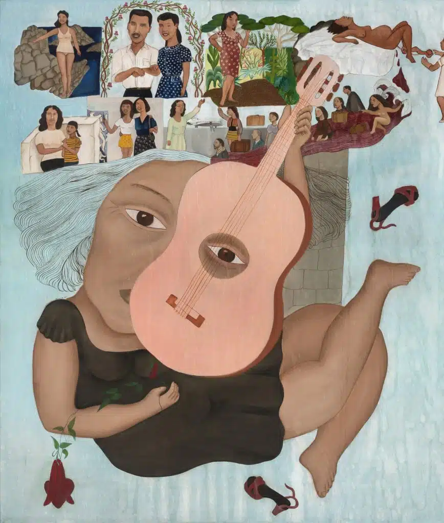 Na tela “Janis Joe (Janis Joplin and Joe Cocker)”, de 1971, dezenas de assuntos distintos são reunidos. Vemos Angela Davis fugindo da prisão – a ativista e filósofa estava encarcerada desde o ano anterior à obra, a partir de acusações sem procedência –, duas mulheres eroticamente entrelaçadas em um banheiro, uma Vicuña adolescente menstruando pela primeira vez e outra voando sobre um jardim, entre outras cenas que incluem a cantora Janis Joplin e o astro do rock Joe Cocker em combinações aparentemente aleatórias.