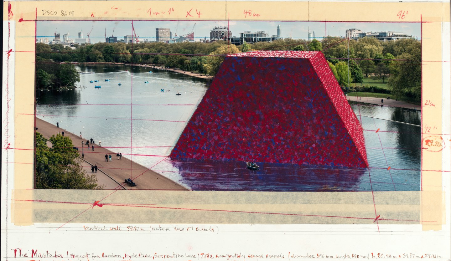 A Serpentine Gallery, em Londres, apresenta a instalação temporária, no Hyde Park, do renomado artista Christo. A escultura é composta de 7.506 barris empilhados sobre uma plataforma flutuante no lago Serpentine Lake, e poderá ser visitada até 23 de setembro deste ano. “The London Mastaba” é a primeira grande obra pública de Christo realizada no Reino Unido, e coincide com a exposição das obras do artista realizadas com sua falecida companheira Jeanne–Claude. A mostra, gratuita ao público, inclui esculturas, desenhos, colagens e fotografias que cobrem a carreira da dupla em mais de 60 anos de produção.
