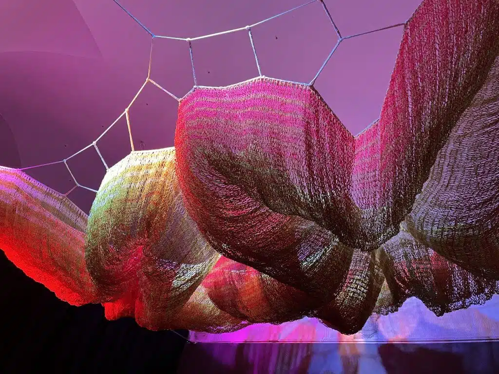Abandonando o casal “cabeça-dura” chegamos à uma escadaria tomada por milhares (15000, para ser exata) de borboletas pretas que conduzem o visitante ao som de uma trilha sonora ligeiramente tensa. É a obra Black Cloud Fashion, do artista mexicano Carlos Amorales ao som da composição Organica, do italiano Carl Brave. Ao fim da escada e já quase tonto pelo extenso túnel de borboletas, chega-se à terra dos unicórnios. É realmente assim que descrevo a instalação Hypermania do islandês Hrafnhildur Arnadóttir. Um corredor de carpete felpudo verde e paredes inteiramente cobertas por cabelos sintéticos coloridos e compridos que faz o ambiente parecer, de verdade, uma nuvem de algodão doce. Tudo é iluminado pelo letreiro Be Afraid Of the Enormity of the Possible.