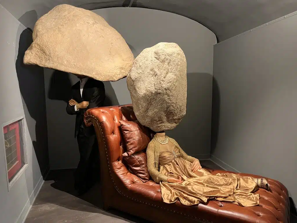 Entrando na última parte do percurso deparamo-nos com duas esculturas intrigantes: um homem e uma mulher vestidos de gala. Ela está deitada em um divã, ele está em pé ao seu lado. Até aí tudo normal, mas no lugar de suas cabeças estão duas pedras gigantes e totalmente desproporcionais com o resto dos corpos de ambos. No início da mostra, lá no pátio do prédio, estão outras quatro esculturas da mesma série que se chama Teenager Teenager e que são de autoria da dupla de artistas chineses Sun Yuan e Peng Yu. A ideia dos artistas é retratar uma fase específica do processo criativo, durante a qual os pensamentos preenchem completamente a mente, que procura a melhor direção a ser seguida.