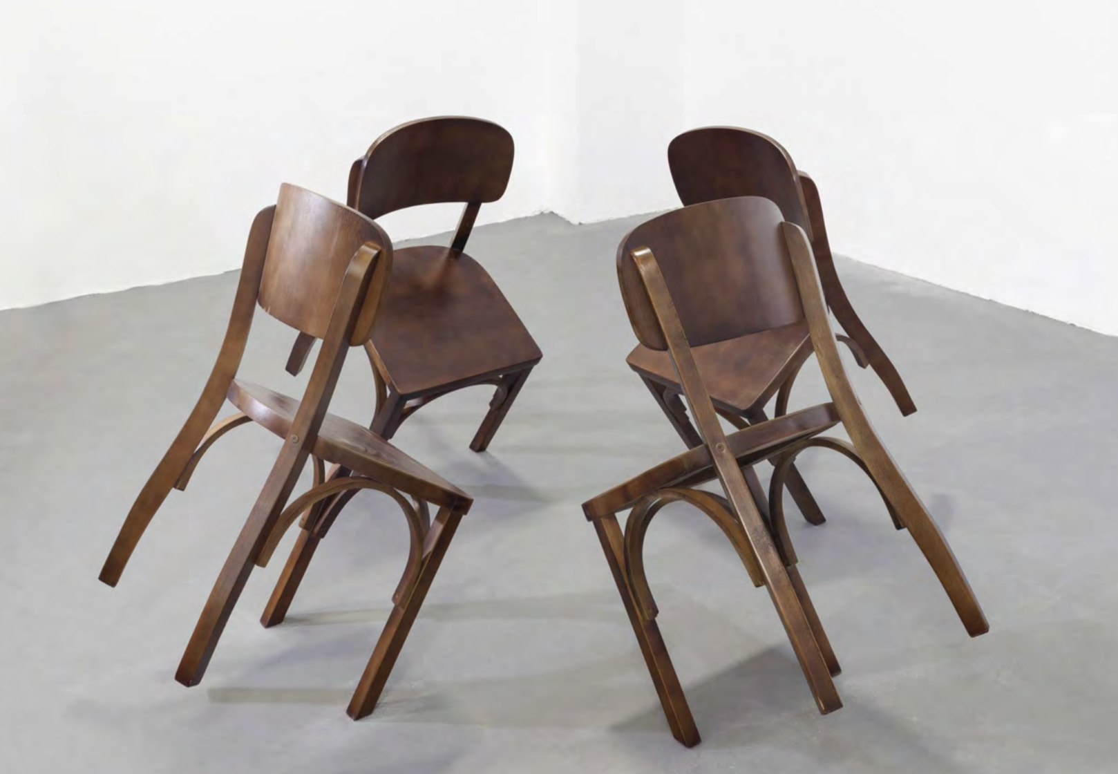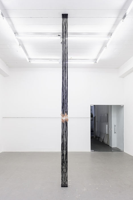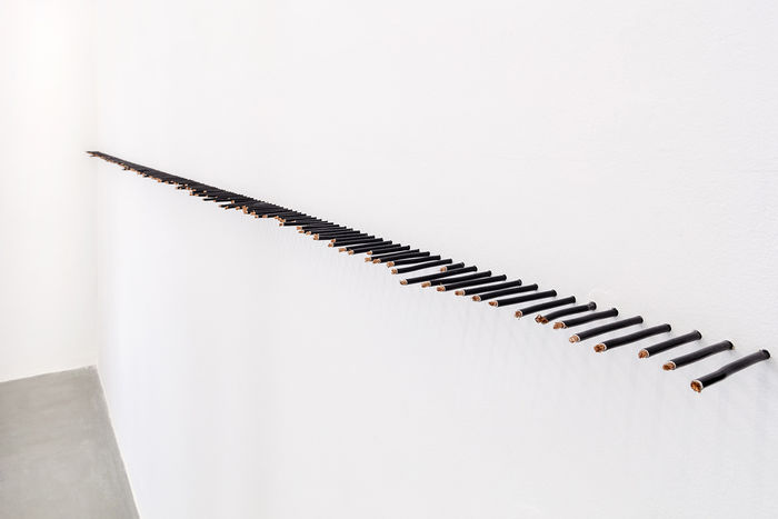 Deolinda Aguiar nasceu em Ribeirão Preto, mas atualmente vive e trabalha em São Paulo. Sua pesquisa estabelece diálogos íntimos com a arquitetura dos espaços que ocupa, utilizando materiais estruturais para refletir as e sobre estruturas de poder. Seu interesse pela exploração do espaço arquitetônico e o desejo de alterá-lo informam obras como “Provisório” e “Ilha”, de 2017, nas quais a artista utiliza fios elétricos saindo da parede, seccionados e dispostos horizontalmente, com as pontas desencapadas, ou então presos ao piso e ao teto, formando uma espécie de coluna frágil que emula a sustentação da sala, mas que na realidade permanecem tensionados por uma última fina ligação.