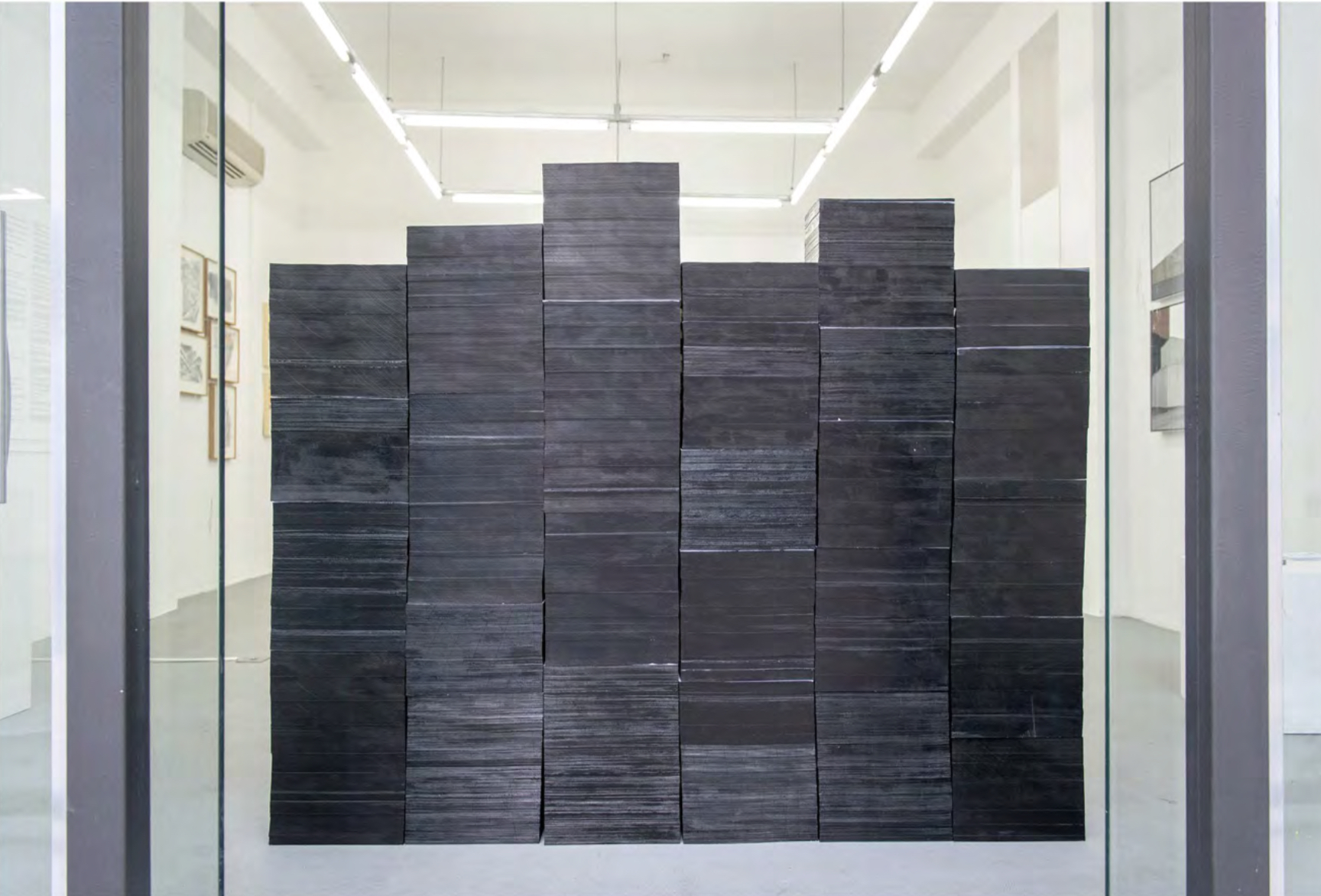 Já “Mil folhas e Três blocos” é uma instalação formada por 4 toneladas de papel A4 que Aguiar conseguiu recolher de diversas instituições públicas em São Paulo. Os papéis são agrupados em blocos, revestidos por cola branca com corante preto, impedindo o sujeito de manipular as folhas e, por consequência, ter acesso ao que está impresso e escrito sobre o material. Empilhados em forma de coluna ou formando como um muro negro, os papéis formam barreiras e tornam-se elementos arquitetônicos que modificam a fruição do espaço expositivo.