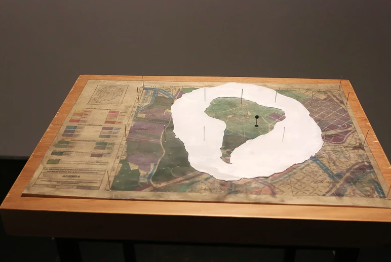 Para além do desenho e suas possibilidades expandidas, Eduardo Hargreaves também investiga outros caminhos materiais, usando objetos, esculturas, instalações e intervenções. Em trabalhos como “Esses pedaços de ti, América”, ele aplica parafina sobre um mapa para criar um desenho negativo no formato da América do Sul – o mapa cartografa as ruas de Belo Horizonte, e foi retirado da publicação das Diretrizes da Lei de Ocupação e Uso do Solo de 1985. Já em “Desenhos Topológicos”, o artista toma  como ponto de partida esses mesmos mapas das Diretrizes de Ocupação e Uso do Solo de BH, mas agora explorando as páginas referentes às fronteiras: as cidades vizinhas são representadas em branco, sem informações ou dados. Uma sequencia destes espaços são recortados e sobrepostos, intercalados em camadas por chapas de vidro transparente. Ao fundo das transparências e recortes, a presença de uma chapa de ferro se destaca na contra-forma. O conjunto é então preso à uma estrutura de madeira que simula a presença de um dormente, encaixado com leveza sobre uma estrutura de aço.