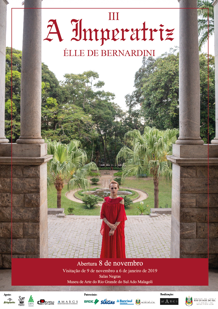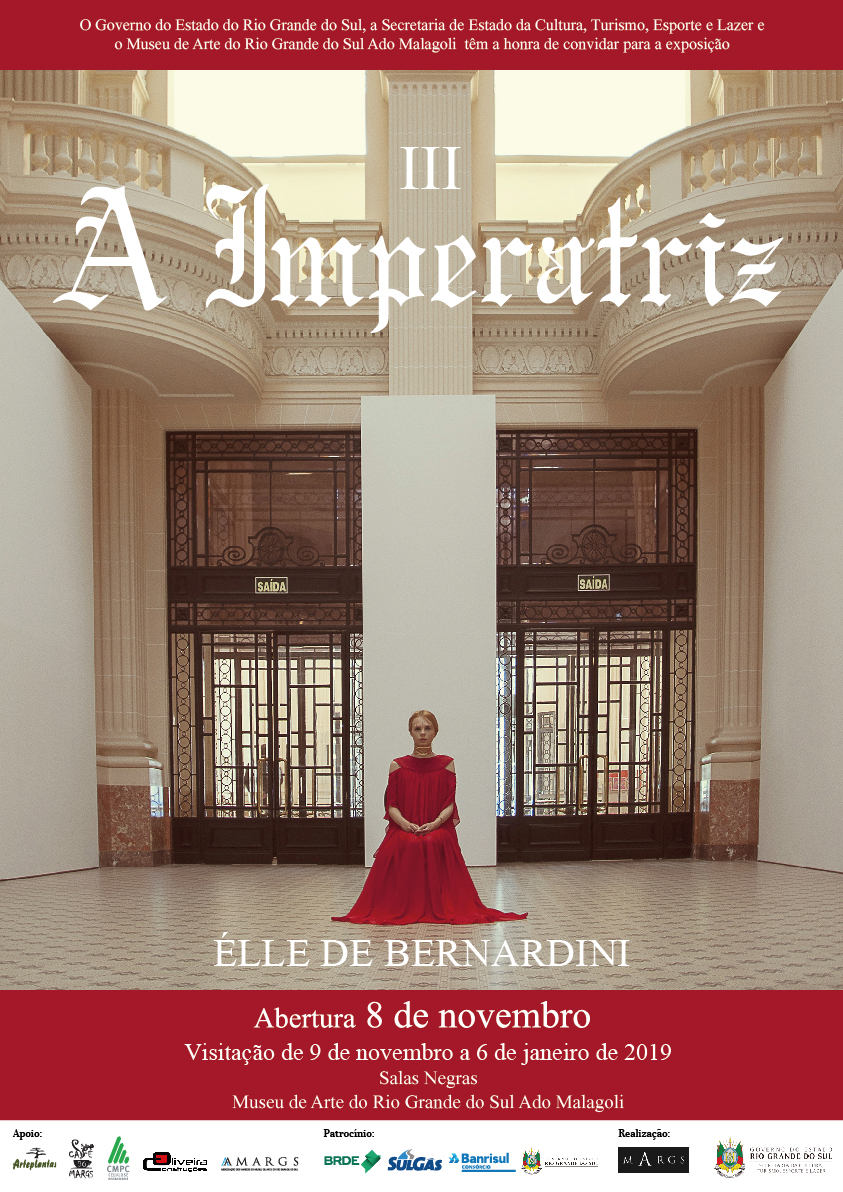 A série de foto-performances, “A Imperatriz” surge de um desejo por preencher uma lacuna histórica na representação de pessoas transexuais na história da arte. É do jogo entre: arquitetura, performatividade de gênero e poder, que emerge a figura da Imperatriz encarnada em mim. É um processo em andamento, e até o presente momento já contou com o apoio das seguintes instituições: Santander Cultural (Porto Alegre), MAC-Niterói (Niterói), MAM-Rio (Rio de Janeiro), Parque Lage (Rio de Janeiro), e Biblioteca Nacional (Rio de Janeiro).