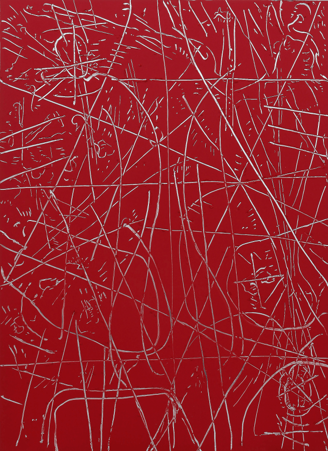 Carvalhosa, por seu turno, utiliza como suporte chapas de alumínio espelhadas ou mesmo espelhos, sob os quais aplica matéria pictórica, por vezes através de grandes áreas de cor, e seu gestual acaba por se fazer presente em linhas que imprime sobre a matéria, destacando o que está “por baixo” da cor. Em Miguez, na sua produção mais recente, a relação entre linha e cor caminha na projeção de espacialidades e arquiteturas, em que o artista faz releituras de pinturas de grandes mestres do Renascimento italiano, porém removendo das cenas os personagens e conservando apenas as situações espaciais.