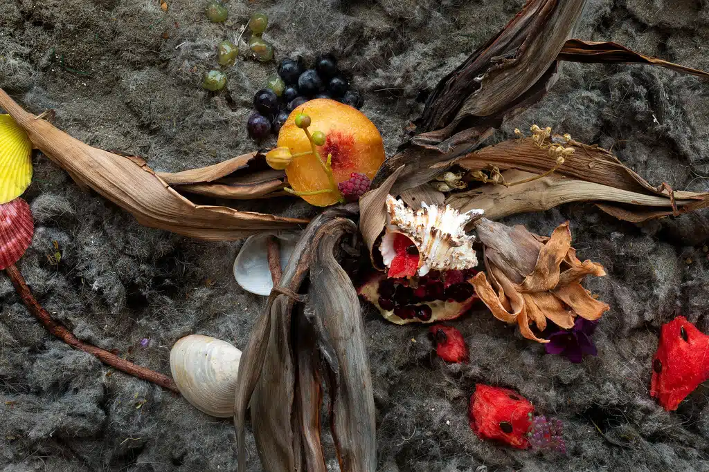 Outro desdobramento da pesquisa de Palma, na qual ela explora as possibilidades da impressão sobre tecidos translúcidos, é exibbido em uma instalação que dialoga com a escala arquitetônica da galeria. A instalação apresenta uma série de “naturezas mortas”, provenientes de fotografias da artista que reúnem folhas secas, plantas, animais, frutas em diferentes estágios de decomposição. Suspensas por todo o pé-direito da galeria, esses tecidos criam uma cena que provoca a reflexão sobre temporalidade e vitalidade.
