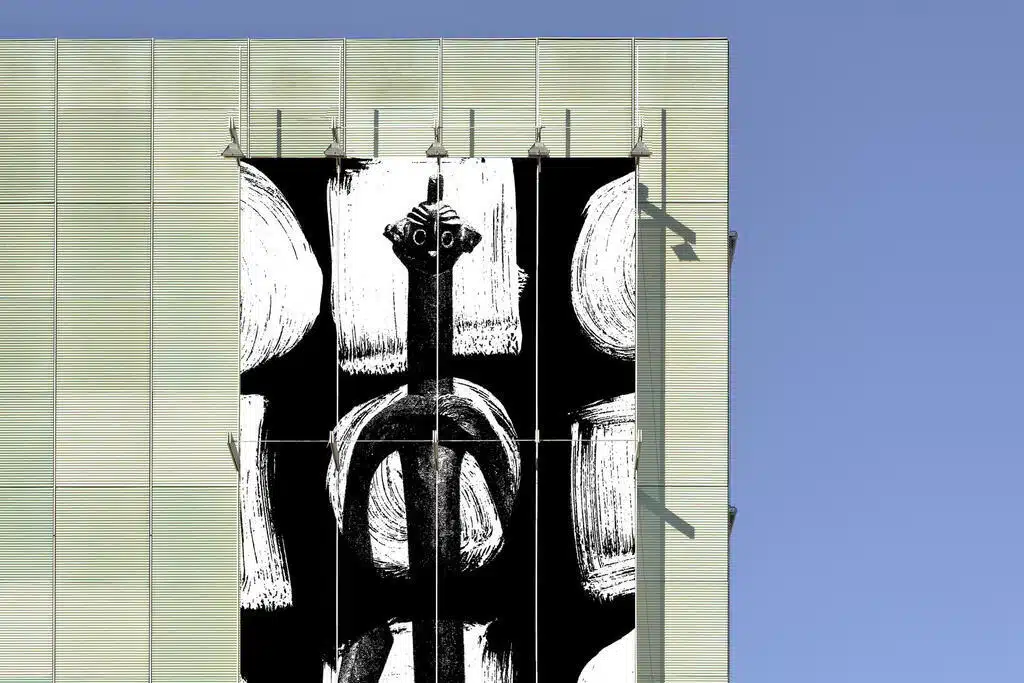 O artista residente do Museu Gardner, Adam Pendleton, lança luz sobre uma história esquecida – ou perturba as histórias estabelecidas ao construir novas associações potenciais. Seus projetos multifacetados, que incluem pintura, colagem, filme e publicação, recontextualizam posições históricas e teóricas sobre abstração, negritude e a vanguarda. Trabalhando predominantemente em preto e branco, Pendleton frequentemente cria instalações que envolvem os espectadores e empurram os limites do discurso contemporâneo. Pendleton cria colagens a partir de materiais encontrados em livros e de seus próprios desenhos e pinturas, serigrafando-os em folhas de filme transparente. Para esta obra de arte, Sem título, (Gigante não em escala), 2019-2020, o artista apresenta uma imagem fotocopiada de uma figura esculpida tirada de um livro, transferida para uma folha transparente e colocada contra uma superfície pintada de círculos e quadrados. A figura, várias vezes removida de sua fonte original, torna-se o tecido conectivo que paira entre a transparência e a opacidade. Ao usar essa estratégia de colagem e justaposição, o artista cria uma nova linguagem visual de encontro cultural e associação.
