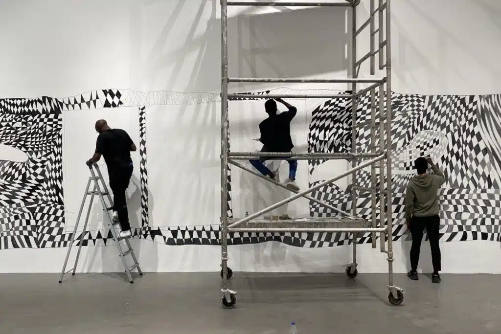 Outras pinturas retratam indivíduos que vivem e trabalham localmente. Colocado na frente do mural, há uma escultura em forma de torre feita de bambu preto, um material amplamente utilizado na África em projetos de construção. As treliças verticais e diagonais da torre ecoam o design geométrico do mural, enquanto sua forma provisória ressoa com as barracas temporárias criadas pelos comerciantes do mercado de Whitechapel: lugares de encontro para conversas, amizade e comunidade.