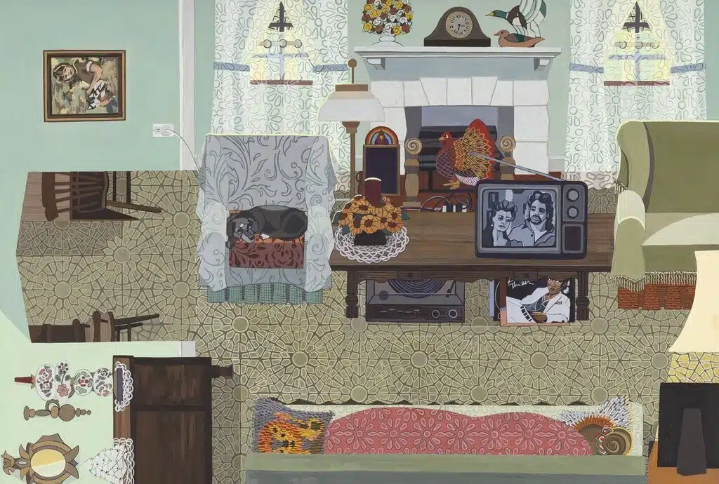A artista Ann Toebbe, baseada em Chicago, apresenta novas pinturas na exposição Days of Our Lives. A memória sempre foi um tema proeminente no trabalho de Toebbe. Em Days of Our Lives, ela reflete sobre o tempo gasto e o tempo desperdiçado durante sua adolescência no final dos anos 80 e início dos anos 90, quando falar ao telefone com amigos, jogar videogame e assistir televisão eram coisas de vital importância. Embora esses momentos leves estejam espalhados por todas as pinturas da mostra, o pano de fundo é o cuidado afetuoso que a mãe de Toebbe fornecia em sua casa de infância no oeste de Cincinnati. A pintura School Morning retrata sombras projetadas na luz da manhã. Toebbe acabou de acordar e vê seu uniforme escolar arrumado por sua mãe sobre o radiador para que ela possa se vestir no calor do ar quente. A pintura Tornado Warning captura uma cena de piquenique com lanches, um rádio e velas dispostas sob as escadas perto dos muitos produtos de lavanderia da mãe – um refúgio gentil longe da tempestade. A parede verde-acelga da exposição destaca Margie’s Hummels, uma recriação de uma coleção de figuras Hummel que a mãe de Toebbe exibia no quarto de infância que a artista dividia com sua irmã mais velha. Este foi um dos muitos objetos com os quais sua mãe decorava a casa, dando-lhe leveza e calor doméstico. As figuras de vidro sobredimensionadas, fundidas e personalizadas são feitas para se parecerem com os objetos de colagem de papel que Toebbe frequentemente adiciona às suas pinturas. Formalmente, Days of Our Lives adota uma abordagem “vale tudo”, com Toebbe experimentando figuração e utilizando imagens de fotos pessoais, memórias e pesquisas no Google. Como sempre, a estratégia compositiva intuitiva de Toebbe gera uma ampla gama de perspectivas; sua técnica de pintura altamente pessoal baseia-se tanto em seus anos formativos estudando escultura quanto em seu papel atual como professora de pintura. Agora, como artista estabelecida e criando filhos adolescentes, Toebbe demonstra profunda apreciação pela dedicação de sua mãe em cuidar dos menores detalhes da vida.