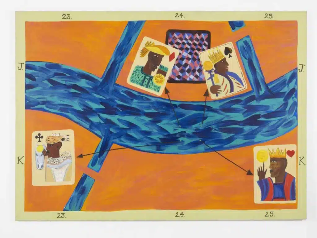 Beneath the Surface, exposição coletiva com curadoria da diretora sênior da Lehmann Maupin Isabella Icoz, reúne o trabalho de Heidi Bucher, Alex Gardner, Lubaina Himid, Shirazeh Houshiary, Araba Opoku e Calida Rawles – seis artistas que utilizam a água como meio, metáfora e método artístico. Para muitos dos nomes em Beneath the Surface, a água é um veículo para o ato de fazer, e as propriedades naturais e o movimento da água definem seus processos e tomam forma na tela. Para outros, a presença da água cria oportunidades metafóricas ou literais para a exploração de histórias culturais e pessoais, transformando o espaço aquático num meio de construção ou desconstrução de várias formas identitárias. Em toda a exposição, a tinta é diluída, as telas são inundadas e os pincéis embebidos; as imagens são refletidas, os corpos submersos e os rios são forjados. Como um todo, a exposição pede ao espectador que considere a água além do cotidiano, posicionando-a, em vez disso, como uma lente através da qual se pode considerar essas obras. Na mostra, os artistas chamam a atenção para a água como uma força vital, um recurso, um espaço habitável e um material funcional. As obras de Alex Gardner, Lubaina Himid e Calida Rawles representam imagens da água que exploram a construção da identidade e sua interseção com a história. Em suas mais recentes obras em pastel, Rawles continua sua investigação sobre a água como um material físico multifacetado e um espaço historicamente carregado para corpos negros. O pintor Alex Gardner faz figuras anônimas em paletas coloridas em negrito, utilizando uma linha de fundo dura contra fundos suaves para explorar os pontos em comum entre culturas. Na série Venetian Maps, a artista Lubaina Himid presta tributo à cidade de Veneza, que tem como limite a água. Heidi Bucher, Shirazeh Houshiary e Araba Opoku empregam a água como parte integrante de seu meio ou processo de fabricação, fazendo imagens da água e capturando seus efeitos. Em sua série de desenhos dos anos 1980 Wasserzeichnung / Water, Bucher usa pinceladas gestuais em aquarela e guache para criar “naturezas-mortas de água”. A prática de pintura de Houshiary emprega água de maneira semelhante. Ela dilui fortemente seus pigmentos e permite que eles fluam através de suas telas enquanto manipula seus movimentos. Em sua prática, Araba Opoku utiliza a água como um meio para criar imagens que tanto consideram a água como um recurso sociopolítico quanto imitam seus efeitos físicos.
