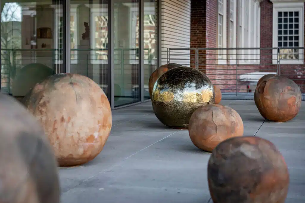 Uma nova instalação de esculturas do artista mexicano Bosco Sodi (nascido em 1970) conta com 14 esferas de argila feitas à mão pelo artista nos Museus de Arte de Harvard, marcando a primeira apresentação de arte no terraço ao ar livre da Broadway do museu. A prática de Sodi explora os elementos da terra, combinando tradições antigas de esculpir argila com uma visão contemporânea de criar formas universais simples que promovam a reflexão. Recorrendo a técnicas centenárias transmitidas pela cultura Zapoteca, Sodi trabalha com artesãos de Oaxaca, usando argila local para esculpir cada esfera, secando-a ao ar livre por até oito meses e depois cozinhando-a em um forno construído na praia. As formas de terracota resultantes revelam os efeitos das forças da natureza – sol, ar, mar e fogo – como demonstrado pelas rachaduras, lascas e manchas escurecidas e ríspidas que distinguem cada esfera. Pela primeira vez em uma instalação do trabalho do artista nos Estados Unidos, Sodi também apresentará três esferas esmaltadas em ouro como parte de sua disposição site-specific. Passando de fora para dentro dos museus, essas esferas douradas se conectam e dialogam com a atmosfera meditativa evocada pela instalação de figuras budistas na Galeria 1610.