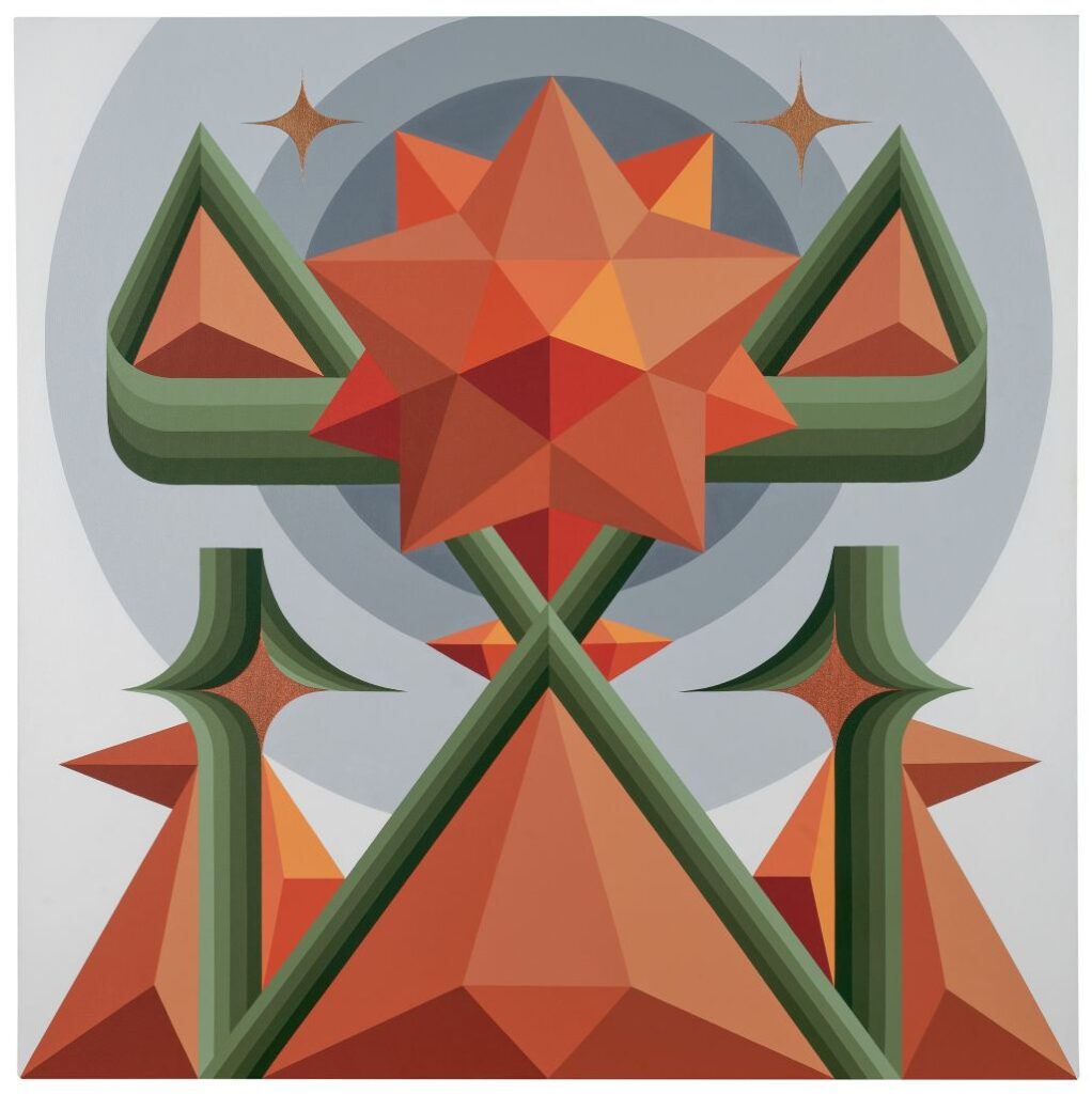 Com 15 obras inéditas, os trabalhos que integram “Caminho” e cuja linguagem gráfica une influências do design, abstração geométrica, simbologia, arte cinética e street art, retratam um tempo especial na trajetória de Highraff, como conta Luiza Testa em texto curatorial. “Caminho marca uma curva em sua trajetória: é o momento em que ele passa das ruas para o ateliê; isso vem acompanhado da consolidação da matemática e da geometria, que tomam um lugar antes dominado pela intuição”, explica a curadora. É nesse lugar, segundo ela, onde o artista decide trazer para as obras símbolos carregados de importância pessoal, de espiritualidade e de tradição popular.