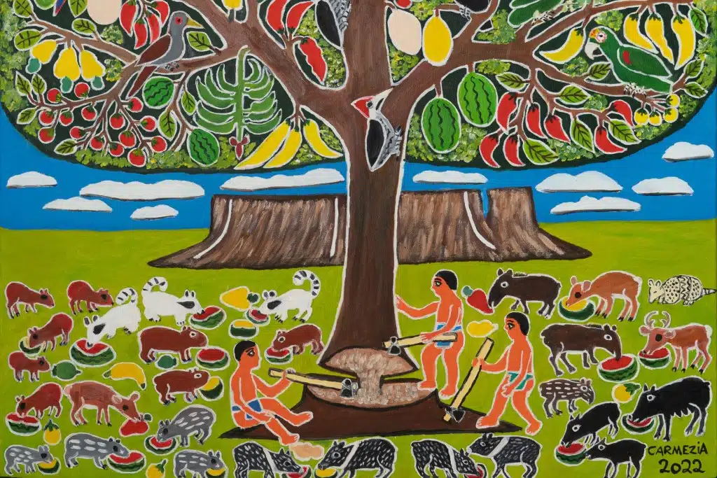Carmézia Emiliano (Maloca do Japó, Normandia, Roraima, 1960) é uma artista de origem Macuxi. Na década de 1990, mudou-se para Boa Vista, quando também começou a pintar. Suas telas figuram paisagens, objetos da cultura material e o cotidiano de sua comunidade: “Minha arte é um serviço que presto à cultura do meu povo, essa é a maior de todas as felicidades”, conta a artista. Oriunda da região fronteiriça com a Venezuela e a Guiana, perto do monte Roraima, a artista reflete, com sua obra, a profusão de detalhes espelhados, intrincados e interconectados de sua observação da natureza e da vida em comunidade. O Masp possui em seu acervo quatro obras de Emiliano, todas comissionadas diretamente à artista no contexto de diferentes projetos desde 2019. Neste sentido, a mostra Carmézia Emiliano: a árvore da vida celebra a relação que o museu estabelece com sua produção e apresenta os trabalhos mais recentes da artista, parte deles nunca antes vista pelo público. Tanto a exposição como o catálogo que a acompanha pretendem ampliar a compreensão da contribuição de sua obra no cenário artístico nacional. O projeto se insere numa sequência de exposições que o Masp vem realizando nos últimos anos em torno de artistas autodidatas que trabalharam fora do circuito da arte contemporânea tradicional e da academia, como Agostinho Batista de Freitas (1927-1997), Maria Auxiliadora (1935-1974), Conceição dos Bugres (1914-1984) e Madalena Santos Reinbolt (1919-1977). Carmézia Emiliano: a árvore da vida é curada por Amanda Carneiro, curadora assistente, MASP.