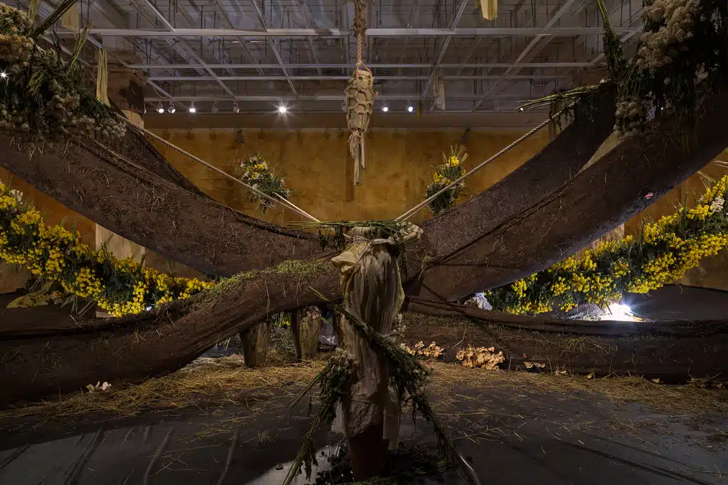 Uma vez no local, o público se depara com grandes estruturas preenchidas de matéria vegetal, as “membras”, que servem de incubadora para a proliferação do mundo orgânico. A instalação é enlaçada por um grande arranjo de flores frescas, crisântemos, que secarão ao longo da mostra. A montagem em espiral vai do chão ao teto, e é contornada por urnas de barro cheias de arroz, que no processo de fermentação propiciam o surgimento de fungos.
