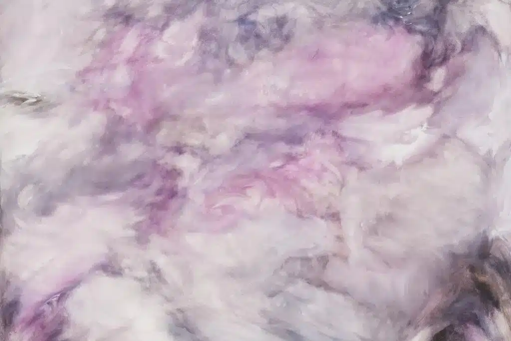 Comprometida com a noção de “pintar apenas com cor e forma”, Matsumoto cria composições imersivas em uma paleta reduzida que articulam a primazia da expressão pictórica. A superfície turbulenta de “Darkness Against Nature” evita a representação e é moldada por um movimento dinâmico e fluido. Nela, a parte superior da tela é dominada por uma forma escura semelhante a um vórtice, cercada por lavagens de azuis, roxos, rosas, cinzas e brancos. Exalando presença, a composição parece manifestar duas forças opostas, presas em uma simbiose caótica ou tentando subsumir uma à outra. Como o título sugere, a obra fala dos atributos imateriais e intangíveis da natureza – luz, ar, névoa, nuvem e as infinitas mutações da sombra – mas também das profundezas inescrutáveis da interioridade.