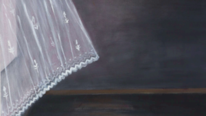 A mostra apresenta mais de uma dezena de pinturas de interiores que transformam a memória em espaço de tensão e invenção. Corredores sem destino, cadeiras vazias, quartos onde a luz se dobra em silêncio: cada tela instala uma ambivalência entre desamparo e resistência, entre o que se perde e o que permanece.
