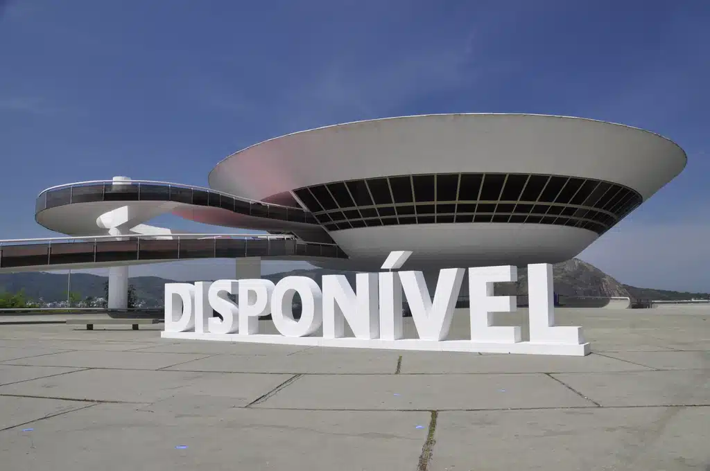 com a palavra DISPONÍVEL diante do icônico edifício de Oscar Niemeyer. O projeto
