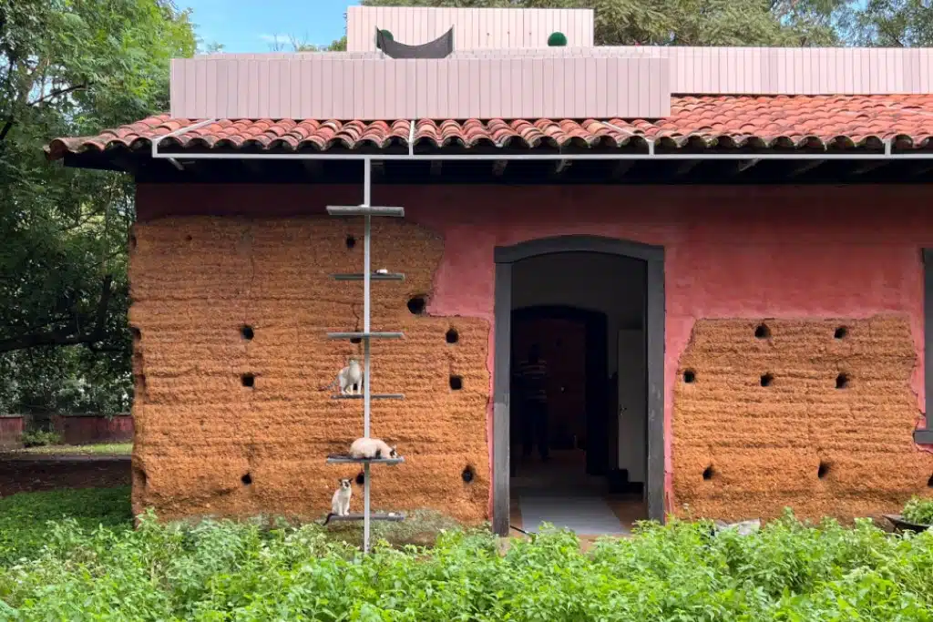 Fato Gato, projeto dos artistas Ana Dias Batista e João Loureiro para a Capela do Morumbi, parte dos gatos de rua que frequentam o lugar. Assíduos mas fugidios, os gatos se deixam avistar pelo visitante ocasional, movendo-se pelos cantos, furtivos. Na maior parte do tempo, contudo, convivem amistosamente com os funcionários da Capela – um vigia, uma faxineira e um educador. As relações desses personagens se desenrolam cotidianamente, alheias à atividade-fim do espaço. Trata-se de um edifício cuja finalidade utilitária, historicamente, nunca se realizou. Os furos nas paredes de taipa sugerem que a construção original, datada do início do séc. XIX, tenha se arruinado antes de ser concluída. Contratado para restaurá-la pelo grupo que loteou os terrenos do Morumbi nos anos 1940, o arquiteto Gregory Warchavchik incorporou as ruínas a uma Capela de estilo eclético, distante do modernismo que ele havia inaugurado nos anos 1920. A Capela não chegou a ser consagrada. A posição de marco histórico, forjada para valorizar o lançamento imobiliário dos “Jardins do Morumbi”, nunca se consolidou. Transformada em aparelho do Museu da Cidade, a Capela recebe poucos visitantes. A circulação dos gatos de rua contrapõe uma realidade bruta, vadia, ao partido suspensivo e anacrônico da arquitetura, e ao mesmo tempo reitera, melancolicamente, o isolamento do lugar. Ana Dias Batista e João Loureiro não ocupam, com obras, o interior da Capela. No jardim lateral, cultivam erva-dos-gatos, uma planta de efeito psicoativo sobre gatos domésticos e outros felinos. O restante de sua intervenção ocorre no telhado: uma estrutura para uso dos gatos, com escada, plataformas e tocas.