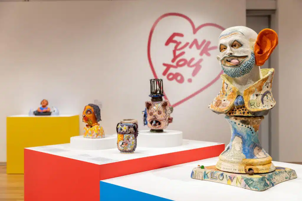 Funk You Too! Humor and Irreverence in Ceramic Sculpture reúne 50 obras de arte desde a década de 1960 até os dias atuais que destacam a argila como uma ferramenta cativante de crítica e sátira. Na exposição, peças de artistas da geração originária do Funk Art são colocadas ao lado de trabalhos de artistas contemporâneos que estão expandindo o legado de humor, subversão e figuração expressiva do Funk. As cerâmicas do Funk surgiram pela primeira vez na Costa Oeste na década de 1960, criadas por um grupo de artistas que compartilhavam uma visão anticonformista em relação às expectativas da “arte boa”. Embora conscientes da atitude irreverente e da estética de seus predecessores, a nova geração de artistas apresentada em Funk You Too! está examinando o potencial do humor na argila por meio de uma variedade de perspectivas. Ao levar o Funk para o futuro, esses artistas estão aproveitando o poder de uma boa piada para abordar algumas das questões sociais e políticas mais urgentes de nosso tempo.