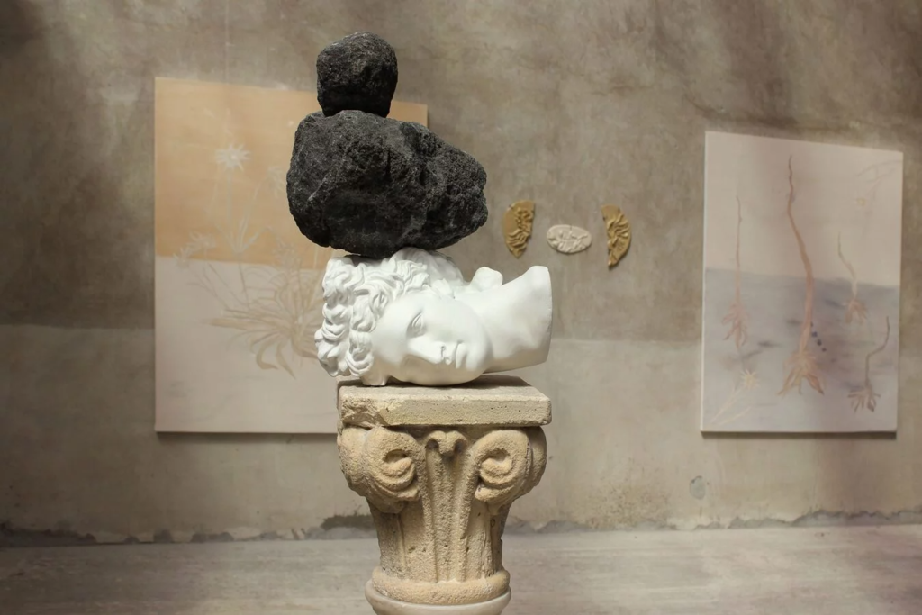 Trabalhando com pedra, fibras, elementos naturais e superfícies construídas, as duas artistas investigam a força simbólica dos materiais e a tensão entre fragilidade e resistência. Em vez de formas concluídas, as obras se apresentam como processos sensíveis — capazes de atravessar épocas, paisagens e imaginários, e de reativar memórias profundas ligadas ao corpo, à natureza e à história.