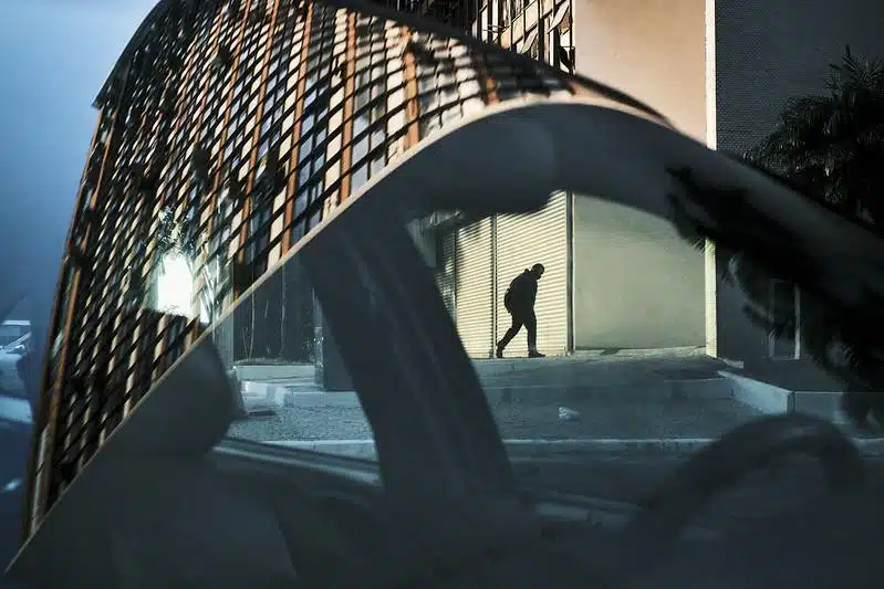A transitoriedade das cidades e as transformações das relações sociais e culturais – a “modernidade líquida”, definida por Bauman – podem ser observadas nas imagens de Gustavo Minas. Cidades Líquidas, em cartaz na Galeria de Fotos do Centro Cultural Fiesp, tem curadoria de Rosely Nakagawa e reúne 55 obras do fotógrafo, que retrata o cotidiano dos grandes centros urbanos com um olhar apurado para a relação do espaço, tempo e o ser humano. Minas captura minuciosamente várias camadas das realidades, definidas por diferentes necessidades pessoais de múltiplos grupos socioeconômicos. Do homem branco executivo que se fecha em um automóvel de luxo, até a diarista que leva horas para se locomover por meio de transporte público lotado. Dos lugares construídos para garantir, em nome do medo e da segurança, o isolamento e a desumanização nas relações sociais e culturais. Leva em consideração que a cidade contemporânea não tem uma configuração de paisagem única, linear, geral. Clica a pluralidade, acentuada ainda mais pela velocidade tecnológica, como a do uso e da transmissão da imagem como instrumento de comunicação, localização e informação. Segundo a curadora, ele “insere seu olhar na percepção de um espaço/tempo cibernético. A experiência de ir e vir é indicada em janelas espelhadas individuais. A realidade presente é a da internet onde quer que estejamos. Conhecemos o lugar pelo link. O sujeito, pelo perfil. As paredes são espelhos, as poucas janelas se abrem para dentro; as portas são túneis de telas planas; as escadas sobem automaticamente para o subsolo. O percurso é um mapa digital, no qual sensores que decidem seu itinerário e indicam que você chegou a lugar nenhum. Suas imagens nos trazem esse desconforto do passageiro no ônibus, que embarca e se senta para ver o sol se pôr nos relógios digitais.” As relações visuais entre o lugar simbólico, o ser e o estar, no entanto, são características marcantes do fotógrafo. Um exemplo são os registros feitos em Brasília, que fogem do estereótipo das formas geométricas arquitetônicas e das manifestações e desfiles no Palácio da Alvorada e destacam os tempos fluidos, líquidos.