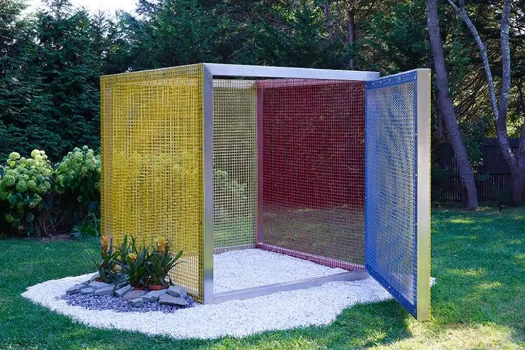 Hélio Oiticica, um dos artistas mais consagrados do Brasil, é uma figura importante na história da arte do final do século XX. Estendendo-se desde meados da década de 1950 até a morte do artista, a trajetória de sua produção começa com pinturas pequenas, abstrato-geométricas, e termina em ambientes imersivos carregados de sensações e projetos participativos politicamente carregados. Oiticica criou várias instalações penetráveis, nas quais o espectador mergulha em cores dentro de ambientes que evocam e celebram as comunidades das favelas do Rio de Janeiro. Penetrável Macaléia (1978) está entre as últimas variações dessa forma concebida por Oiticica. Dedicada a Jards Macalé, famoso músico que era um querido amigo do artista, o projeto dessa obra foi inspirado em uma festa épica na casa de Macalé, descrita vividamente por Oiticica em suas anotações. Luzes de palco iluminavam os artistas nessa estrutura, cobrindo seus corpos de vermelho, azul e amarelo. Ao entrar na instalação Penetrável Macaléia, as telas de malha vermelha, azul, amarela e branca brincam sutilmente com a percepção, lançando cores cintilantes no mundo exterior e dentro dela. Desmaterializando as laterais do objeto, o efeito se combina com a cativante história por trás da obra para subverter a seriedade pesada e austeridade da arte minimalista e sua forma icônica, o cubo. Com a adição de cascalho e plantas vivas, a obra traz de forma lúdica o “mundo real”, especificamente o Sul Global, para o espaço asséptico da arte. Penetrável Macaléia funciona brilhantemente tanto dentro quanto fora, sempre interagindo com seu entorno e seus participantes, fundindo arte e vida.