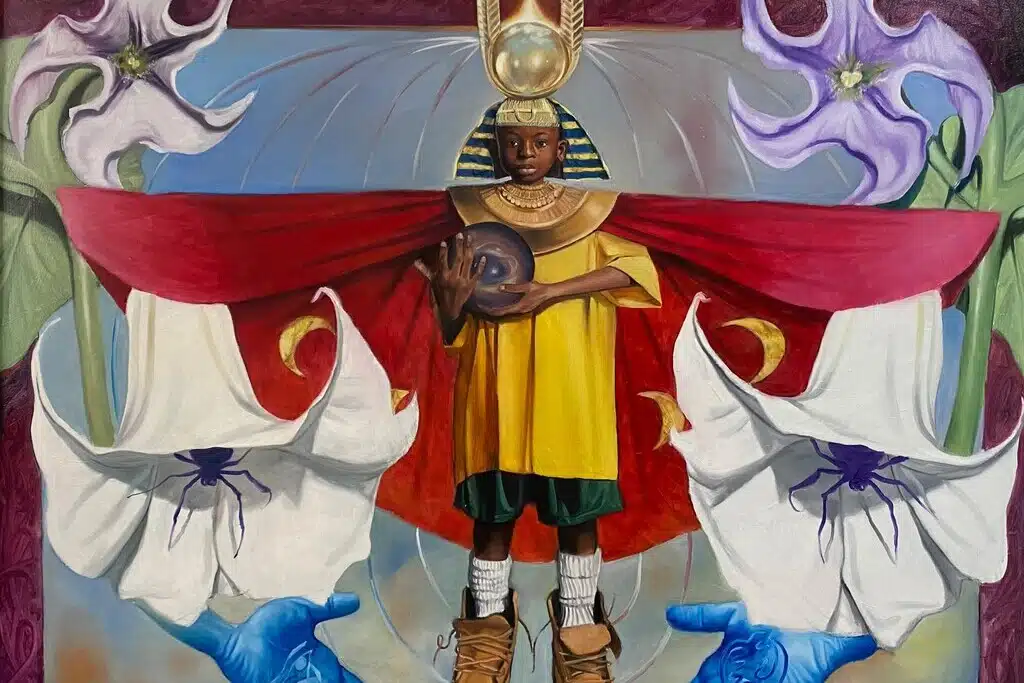 “Mesmo se apresentando como uma entidade de outro planeta, ele se inspirava em coisas mundanas, coisas que estavam ao seu redor. Na obra, eu represento Sun Ra como uma criança, mostrando a beleza e importância de observar ao redor para se inspirar. Coisas simples se tornam grandiosas quando estamos dispostos a vê-las assim. É assim que nasce a obra ‘Inspirações de Sun Ra'”, explica Pegge.