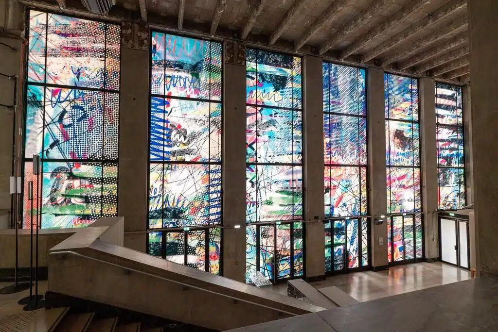 Respondendo ao convite para desdobrar sua pintura por La Zone – a área de entrada livremente acessível do Palais de Tokyo – Renée Levi redefine e expande simultaneamente este espaço, geralmente de passagem. Seu trabalho consiste em uma pintura mural analógica nas paredes internas e um vasto desenho digital que cobre as janelas do edifício, conferindo-lhes a aparência de vitral. Na fachada e nas janelas, o branco torna-se um fundo para a cor, enquanto nas paredes é reservado para sinais e assinaturas. Movendo-se entre opacidade e translucidez, sinais riscados e escritas ressaltam várias características de seu ambiente anfitrião, ao mesmo tempo em que se fundem a ele: os vários tons da pedra e do mármore, a verticalidade e transparência das janelas e a estrutura crua do edifício. Em alguns lugares, traços digitais se transformam em reflexões pictóricas, enquanto em outros, as vogais de um nome se entrelaçam em laços de prata ou fumaça, sinais tornam-se letras, acentos formam linhas de luz, a linguagem se transforma em uma abstração, e o todo constitui uma nova linguagem.