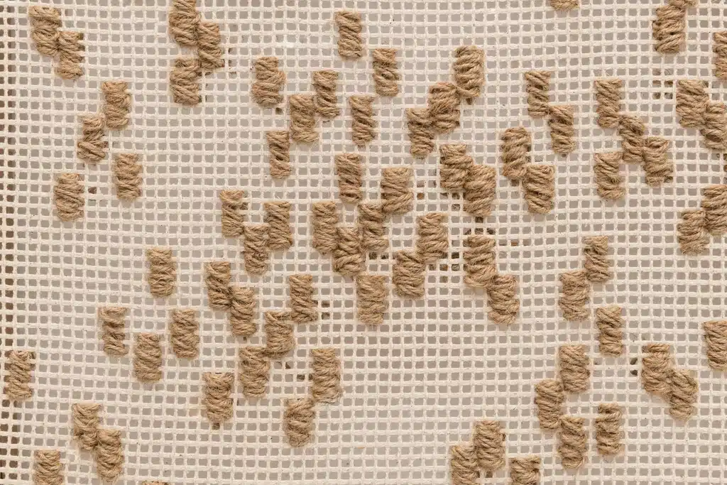 Mesmo nos encontros dos caminhos, há diferentes formas de expressão enquanto materiais e práticas. Dedicando-se ao tecido como suporte, Weffort traz um processo de tecelagem reversa, no qual as formas são obtidas no desfazer da trama. Ela joga com os limites das linguagens artísticas ao inscrever o material de caráter tridimensional na bidimensionalidade normalmente reservada ao desenho e à pintura.