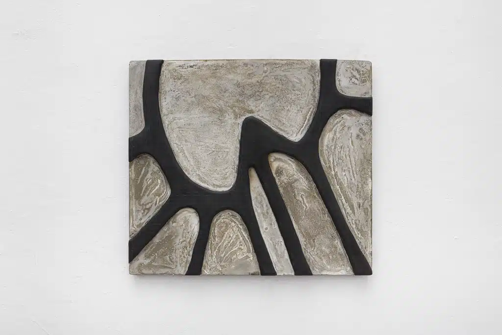 Por fim, entre a superfície entrecortada das formas destes trabalhos, é aplicada uma camada de graute, um tipo específico de concreto comumente utilizado na construção civil. Como em todo o transcorrer de seu fazer artístico, aqui a artista empreende a complexa tarefa de destituir o material de seu aspecto primariamente bruto, fazendo um frutífero uso dos distintos tons de cinza revelados pelo concreto para que estes ganhem aspectos visualmente um tanto mais poéticos — estamos diante da superfície da Lua?