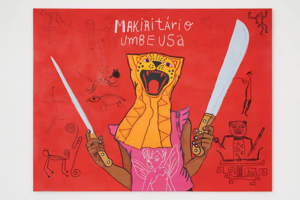 Nova individual de Denilson Baniwa, na galeria A Gentil Carioca São Paulo, Moqueca de Maridos reúne nova série de obras do artista que trazem o imaginário de quadros clássicos e uma iconografia colonial num gesto antropofágico. O título da mostra é retirado de uma coletânea de mitos eróticos indígenas. Para Carlos Fausto, crítico e antropólogo que assina o texto crítico da mostra, “Denilson canibaliza o gesto antropofágico modernista. Não para produzir um nacional por adição, mas para multiplicar as leituras contracolônias. Se o Baniwa é seu lugar de fala, inscrito nas pedras e seus glifos, sua arte também fala através das letras escolares, incertas e inseguras, que formam frases em nheengatu”.